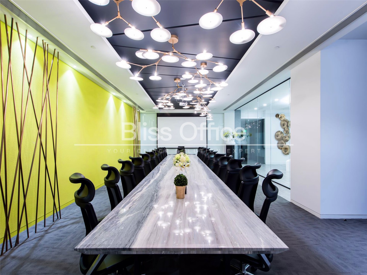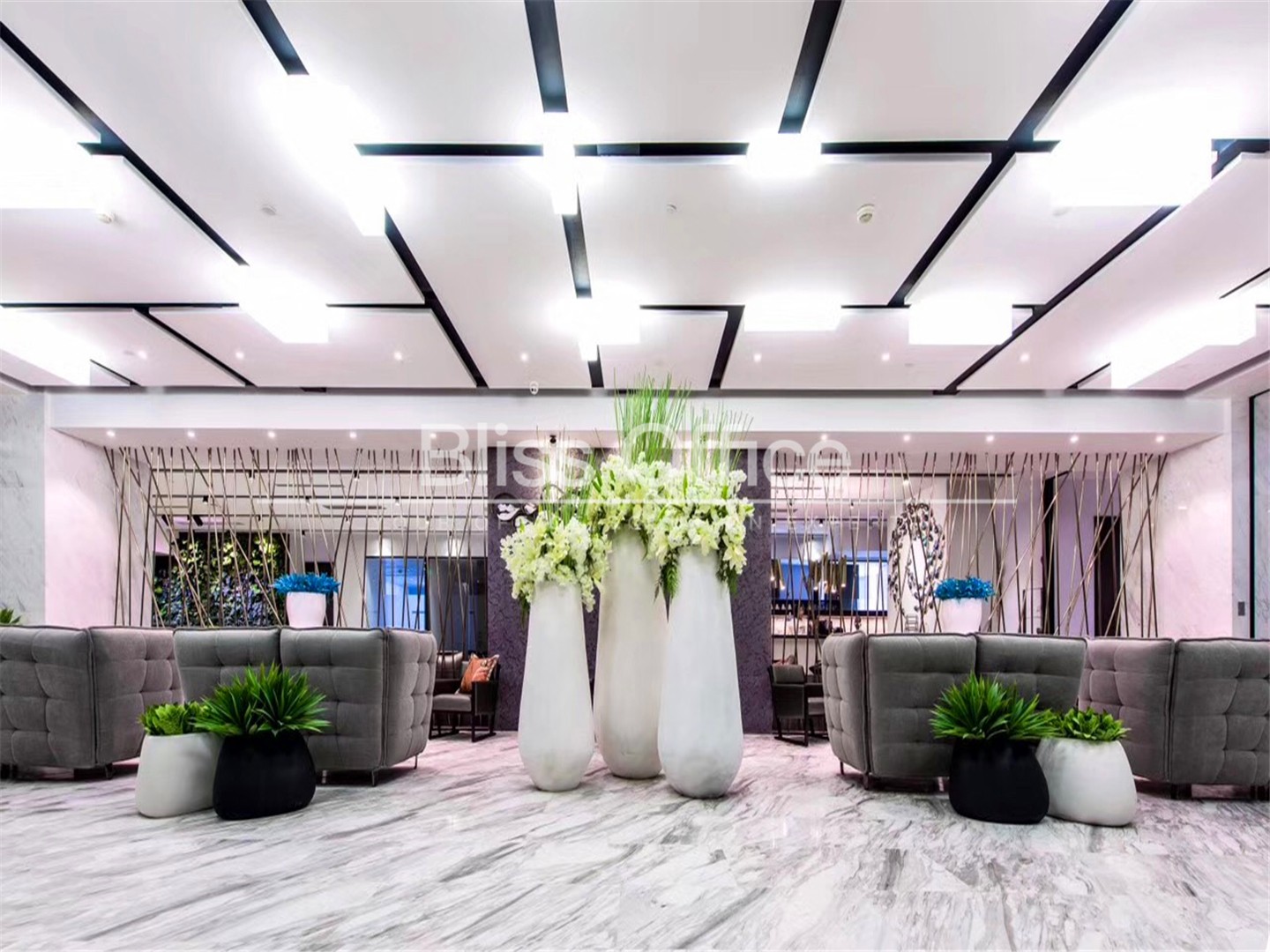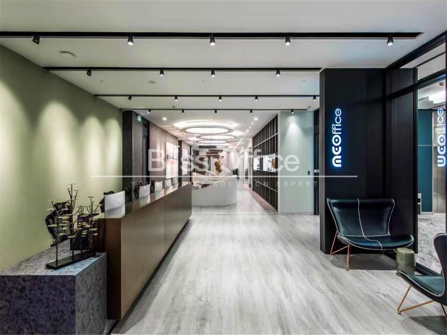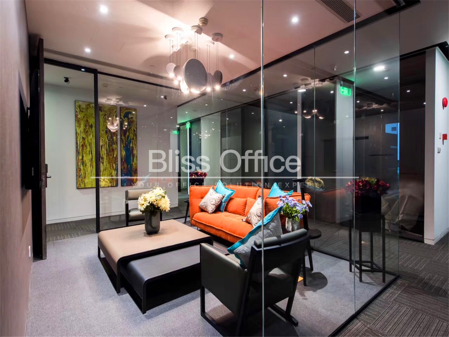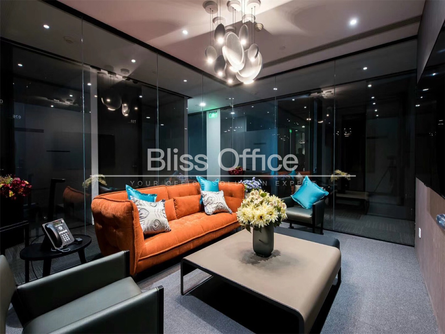 69间可容纳1至12个工作位的独立服务式办公室内置轻奢咖啡区、商务洽谈区、独一无二空中露天花园